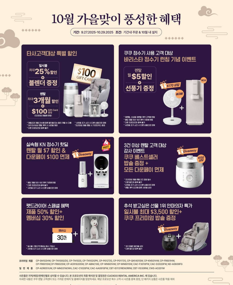 사은품은 지역/매장/판매인별로 상이할 수 있습니다. 본 프로모션의 최종 해석권 및 결정권은 CUCKOO RENTAL AMERICA INC.에 있습니다. 자세한 내용은 쿠쿠 렌탈 고객 센터 또는 가까운 판매처에 문의하세요.